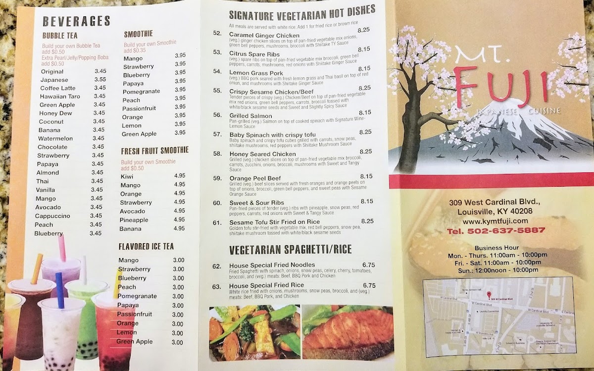 The moment you step into Mt. Fuji Menu, you’re greeted by a warm, inviting atmosphere where delicious flavors await. Located at 309 W Cardinal Blvd in Louisville, KY, this cozy spot offers a variety of mouthwatering dishes that cater to every craving. Whether you're a fan of fresh sushi rolls or prefer something hearty like their sizzling hibachi grill options, the menu has something for everyone. You can indulge in delicate seafood, tender meats, or veggie-packed dishes, all prepared with the utmost care and authenticity. Every meal is designed to transport you to the heart of Japan, with bold flavors and fresh ingredients that bring the menu to life.